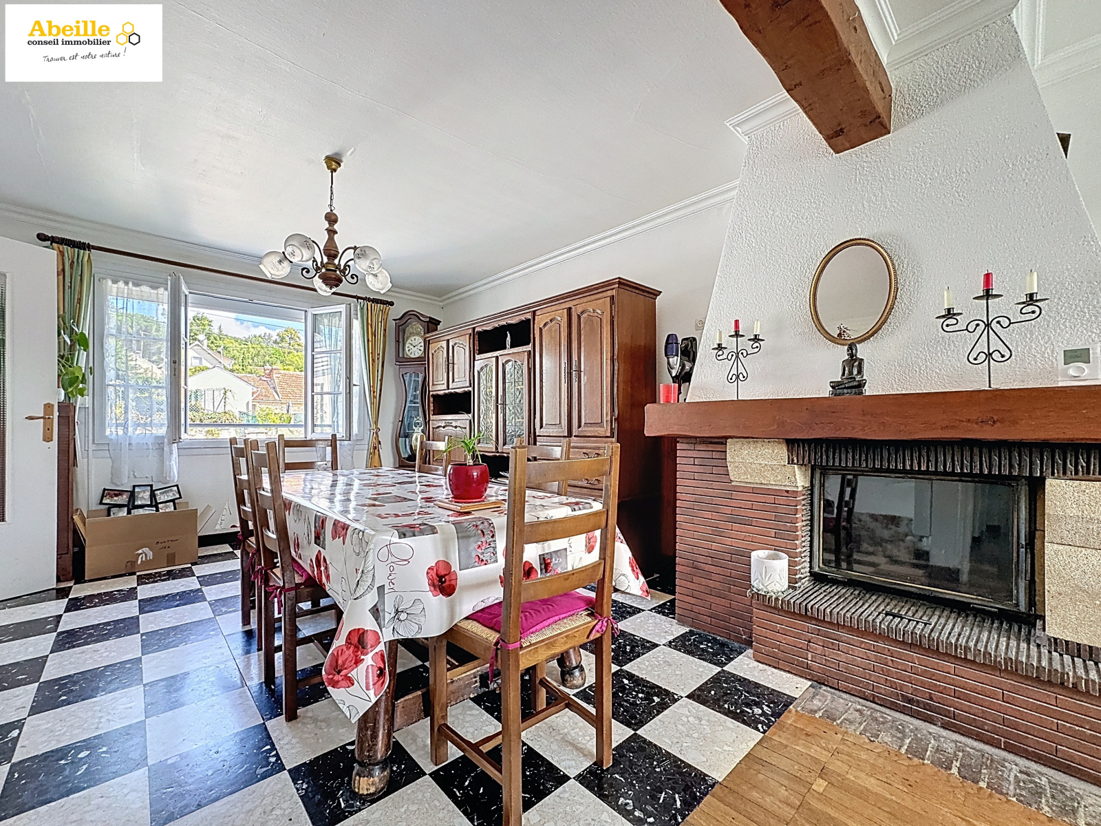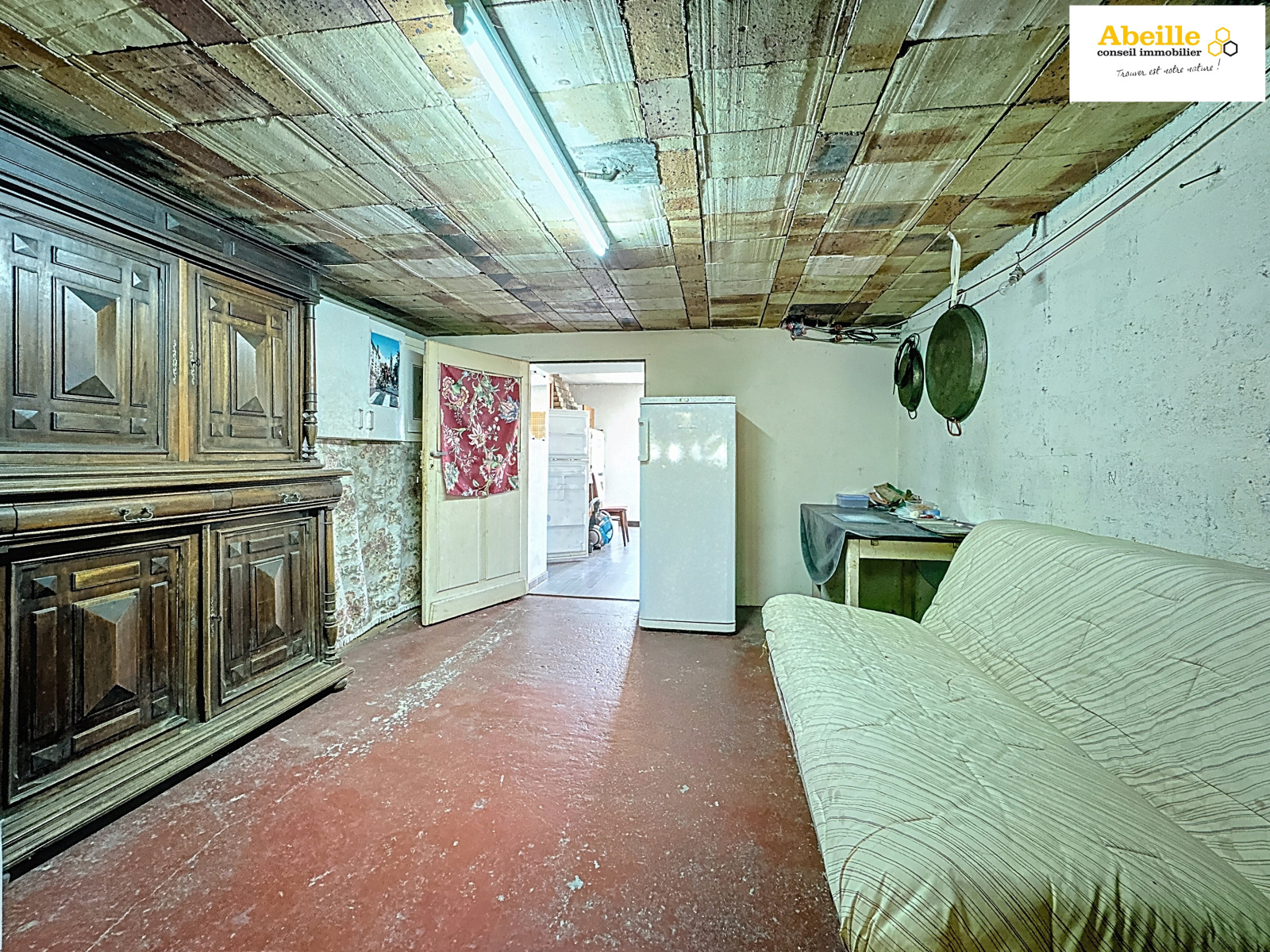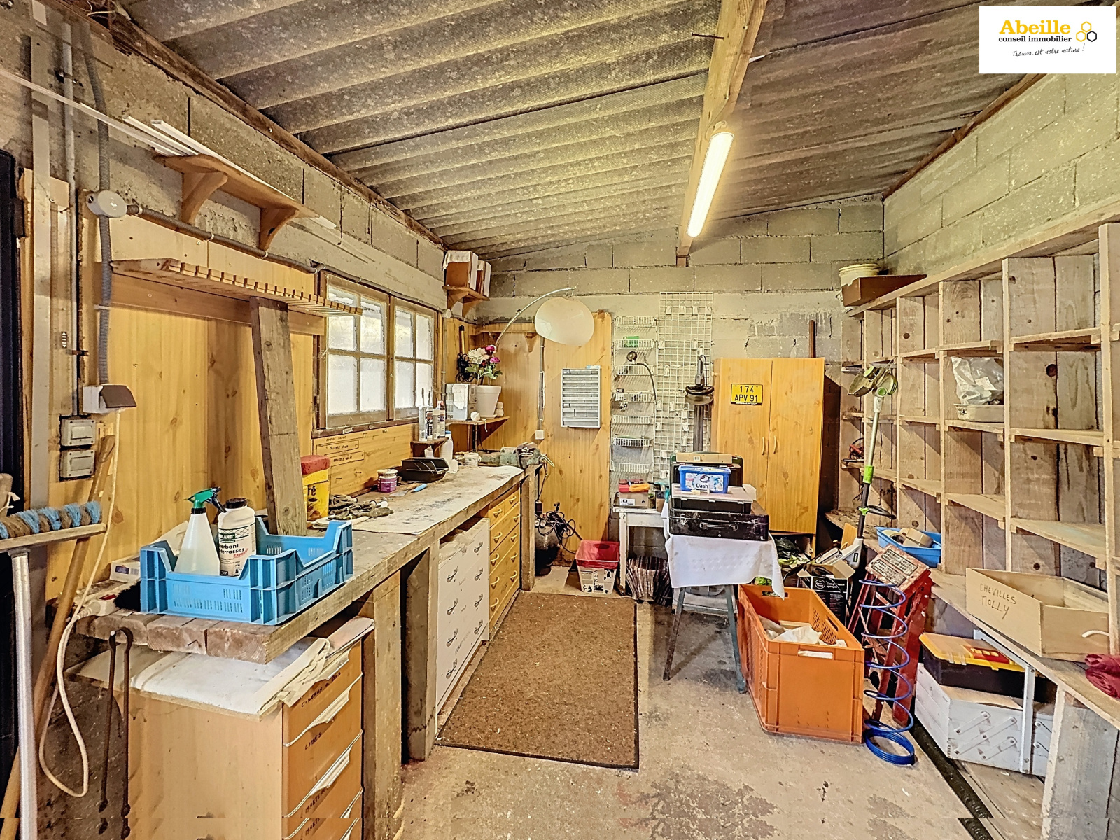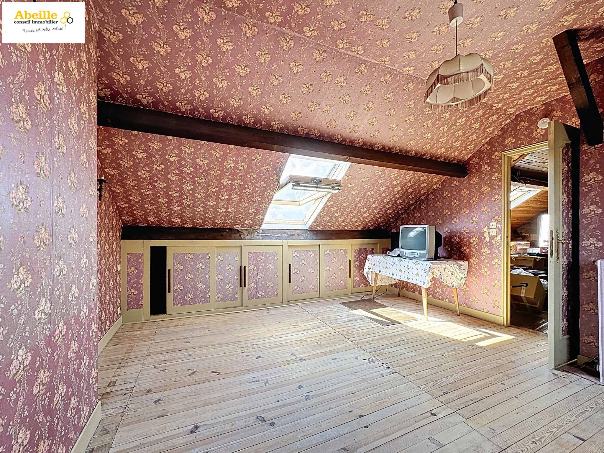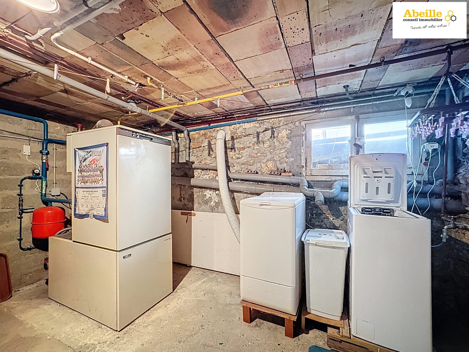 Maison traditionnelle comprenant : entrée, salon/salle à manger avec cheminée, cuisine aménagée. 2 chambres, salle de bains et wc. A l'étage combles aménageables et chambre. Sous-sol total avec garage, buanderie, cuisine d'été et cave. Atelier en dépendance. Terrain clos de 470m2.