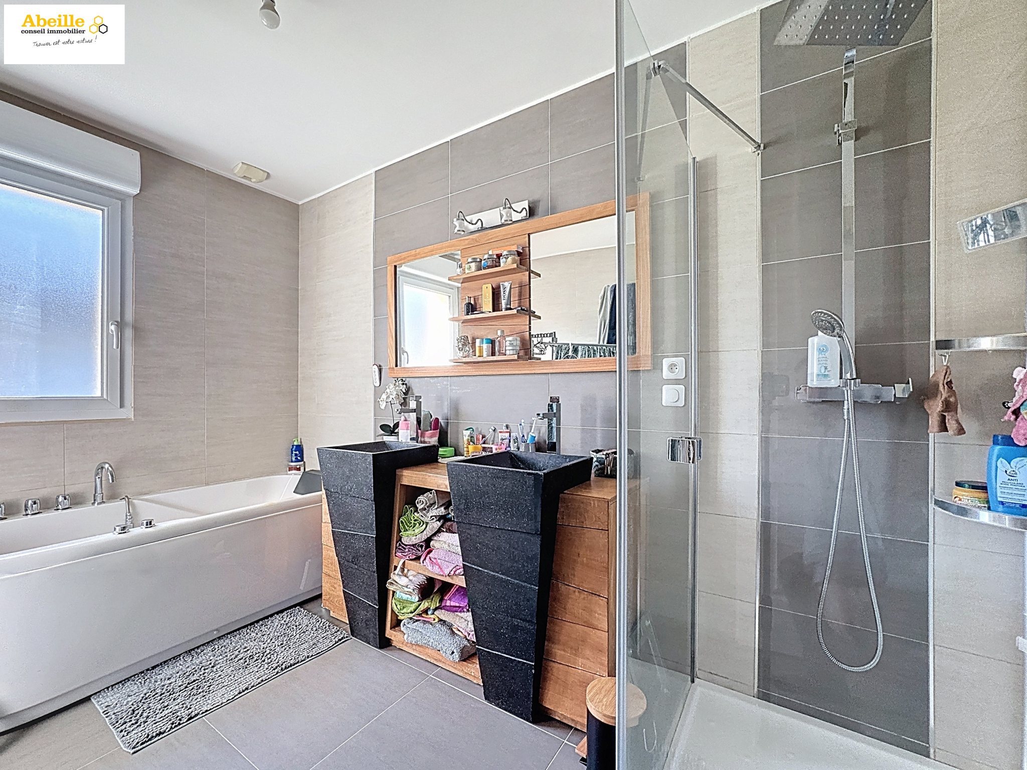 À l’étage, un palier dessert trois chambres aux surfaces confortables d’environ 13 m², 12,5 m² et 11 m², une salle de bains avec douche, ainsi que des WC séparés.