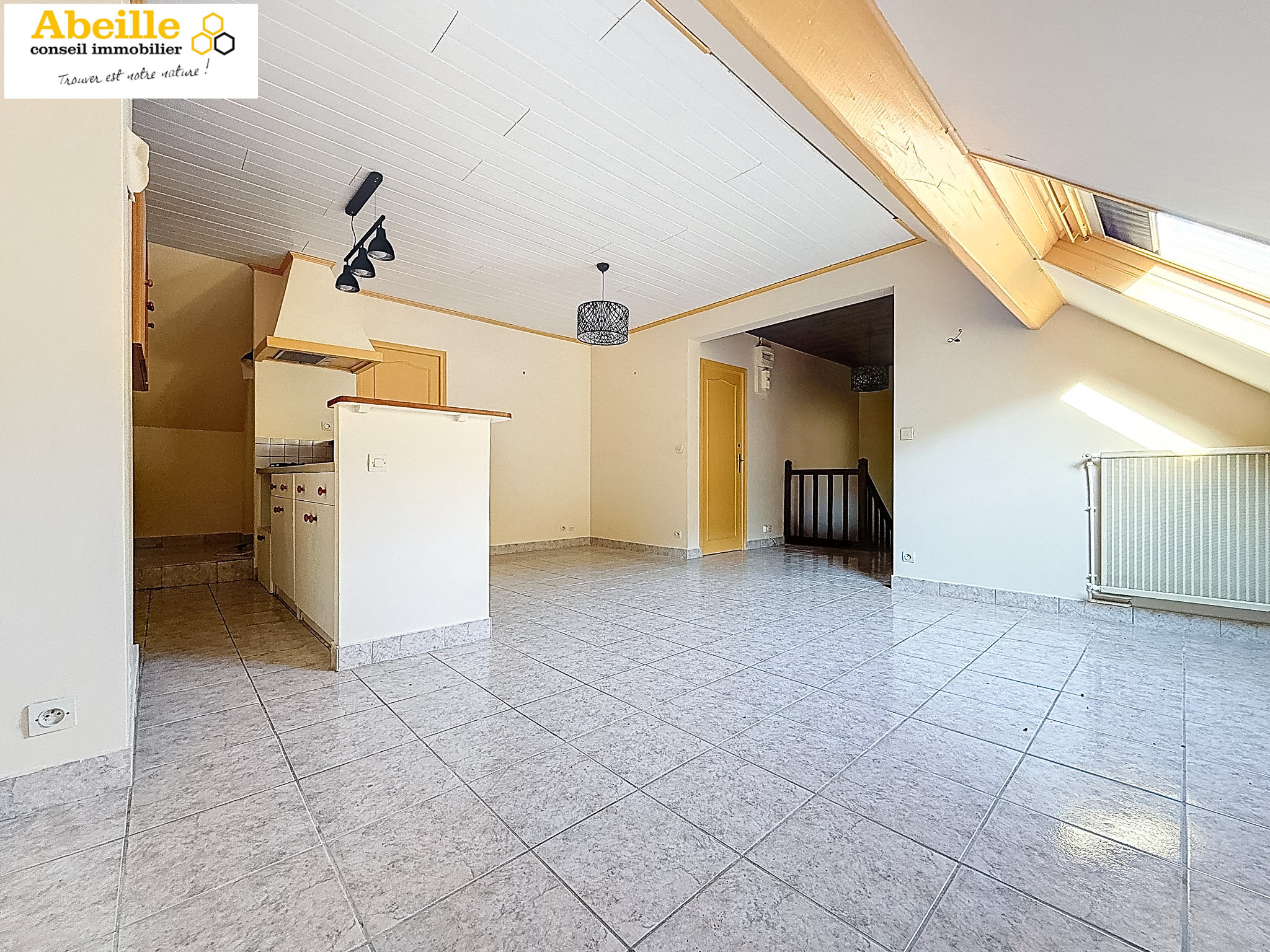 À l’étage, un séjour avec cuisine américaine, une salle de bains avec WC et deux chambres complètent l’ensemble.