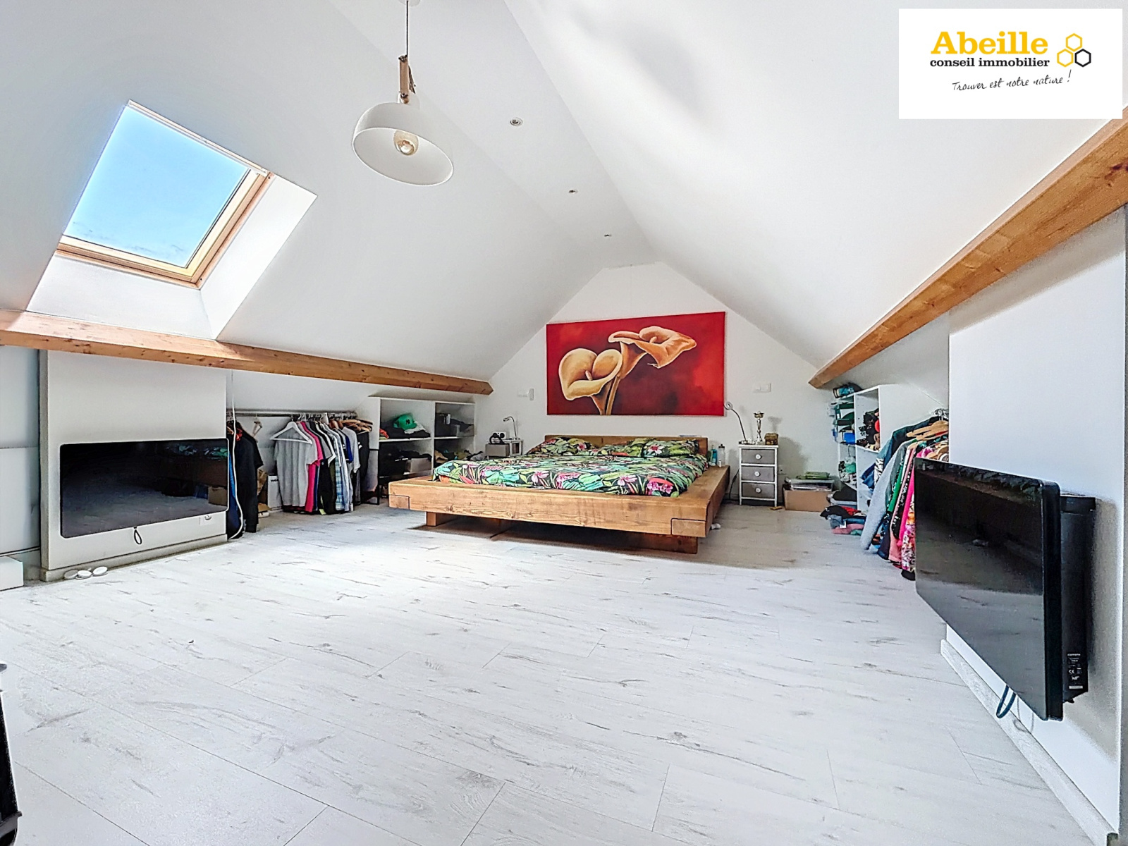 Au deuxième étage, une spacieuse chambre de 17 m² habitables (35 m² au sol) avec rangements complète l’ensemble.