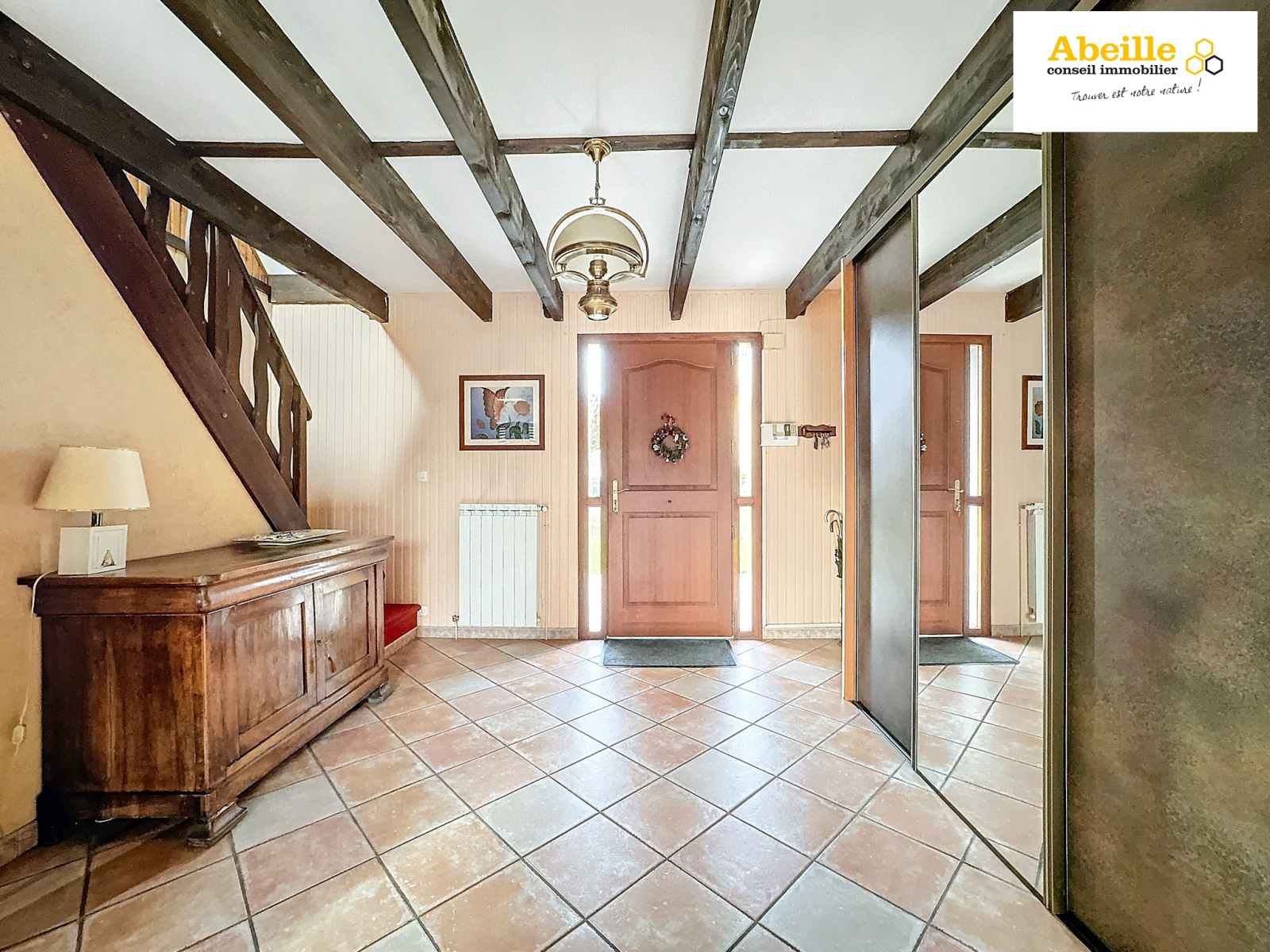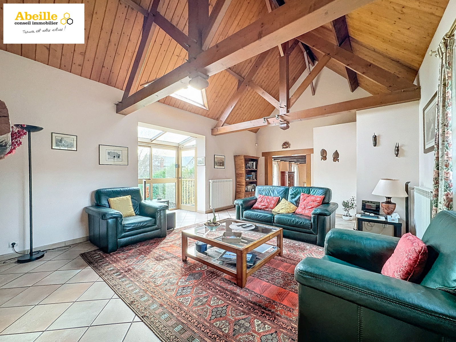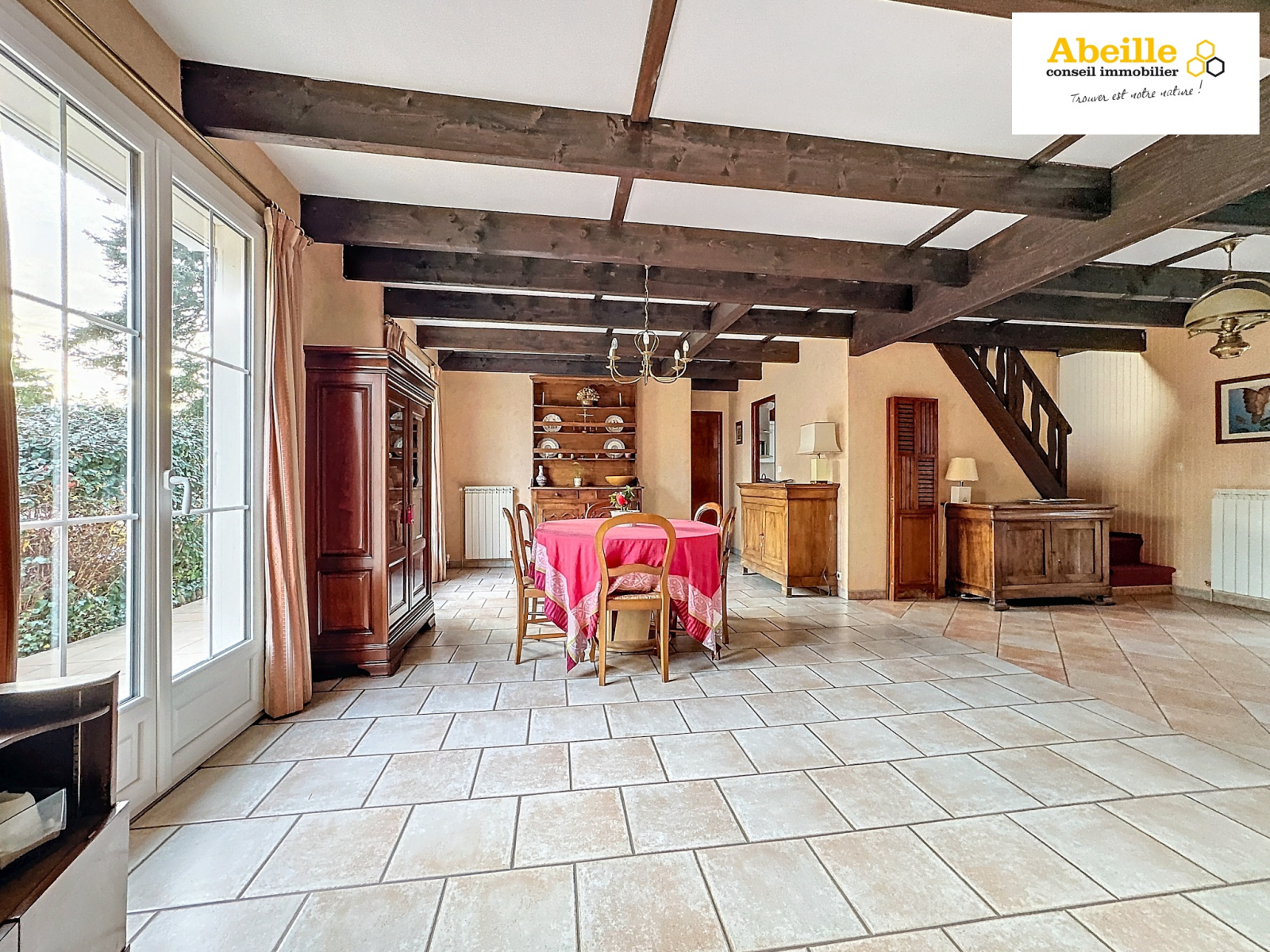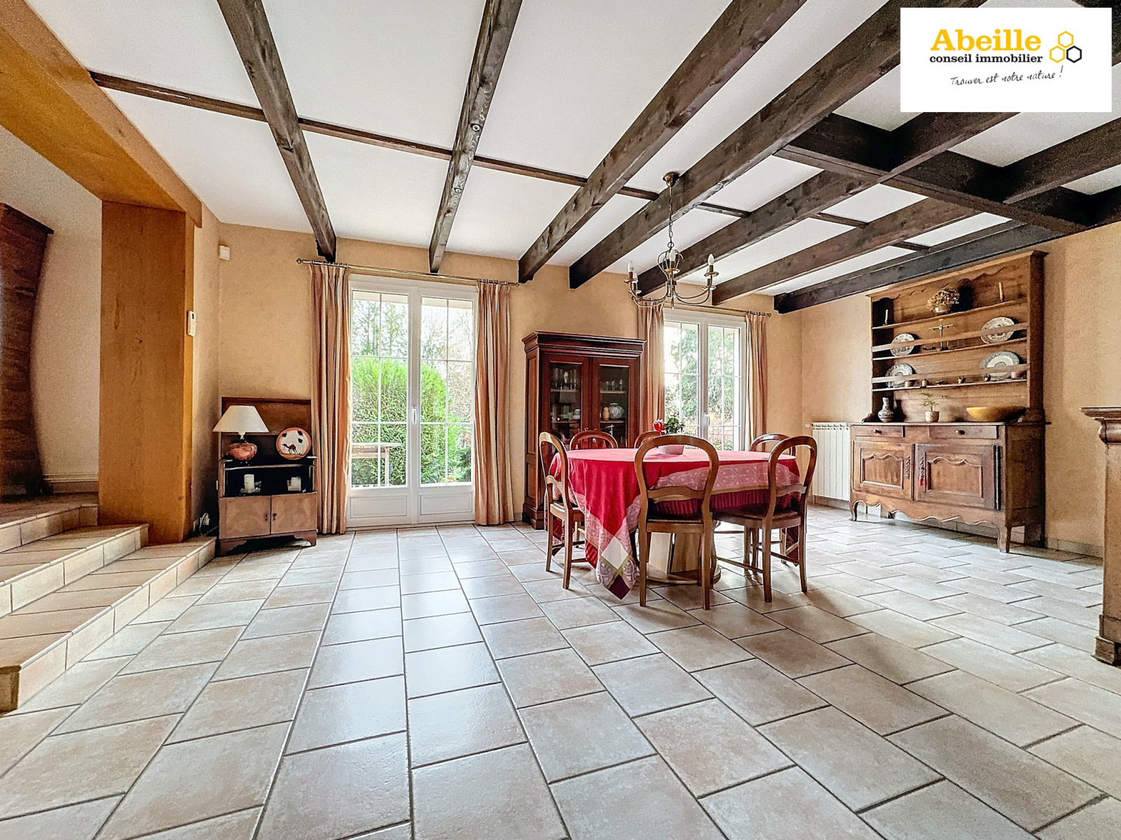 Au rez-de-chaussée, vous serez accueilli par un hall d’entrée avec placard, une salle à manger ouvrant sur une terrasse exposée plein sud, une cuisine aménagée et équipée, ainsi qu’un spacieux salon/séjour cathédrale agrémenté d’une cheminée et d'un bow-windows. Un bureau et des toilettes complètent ce niveau.
