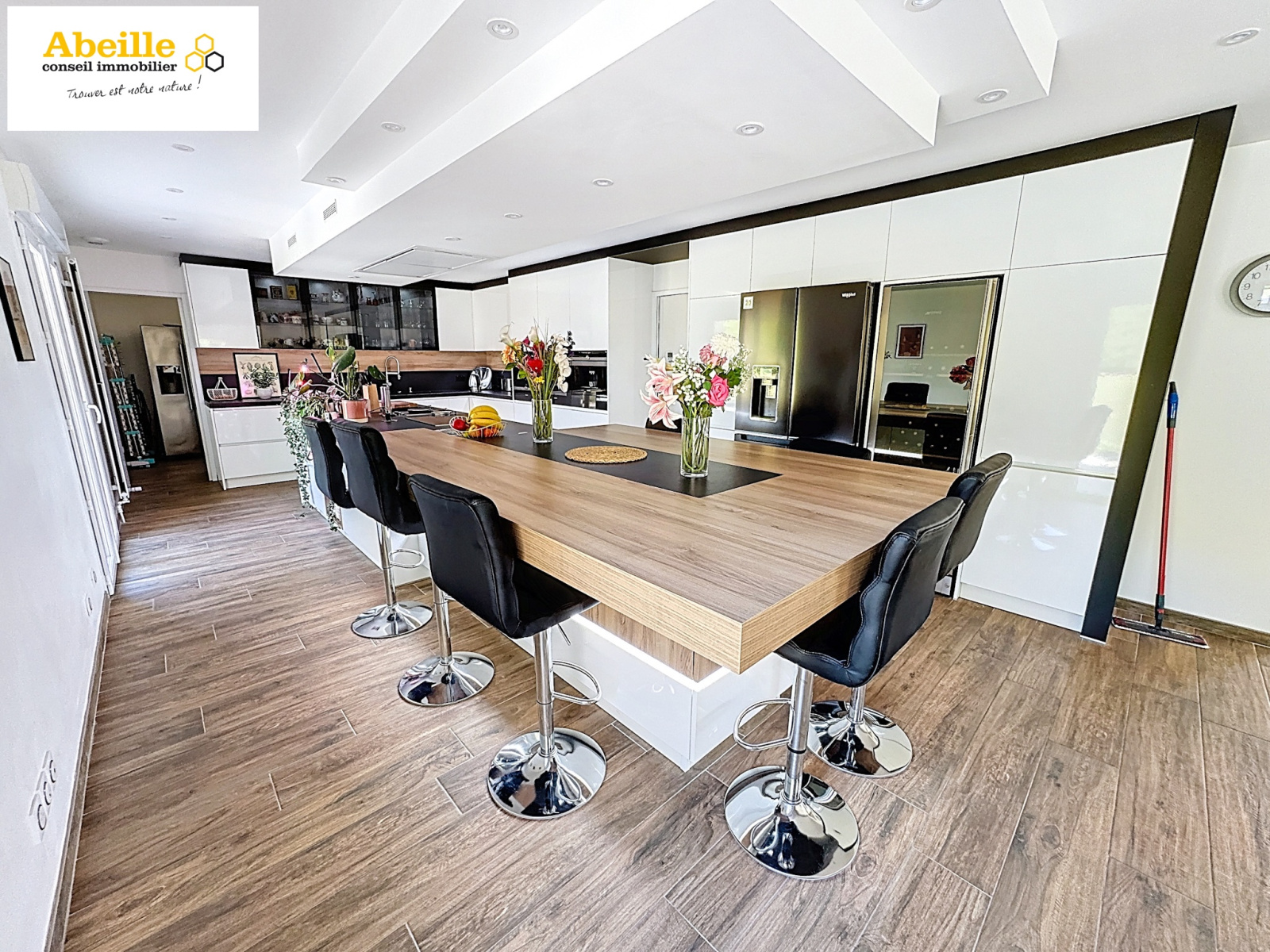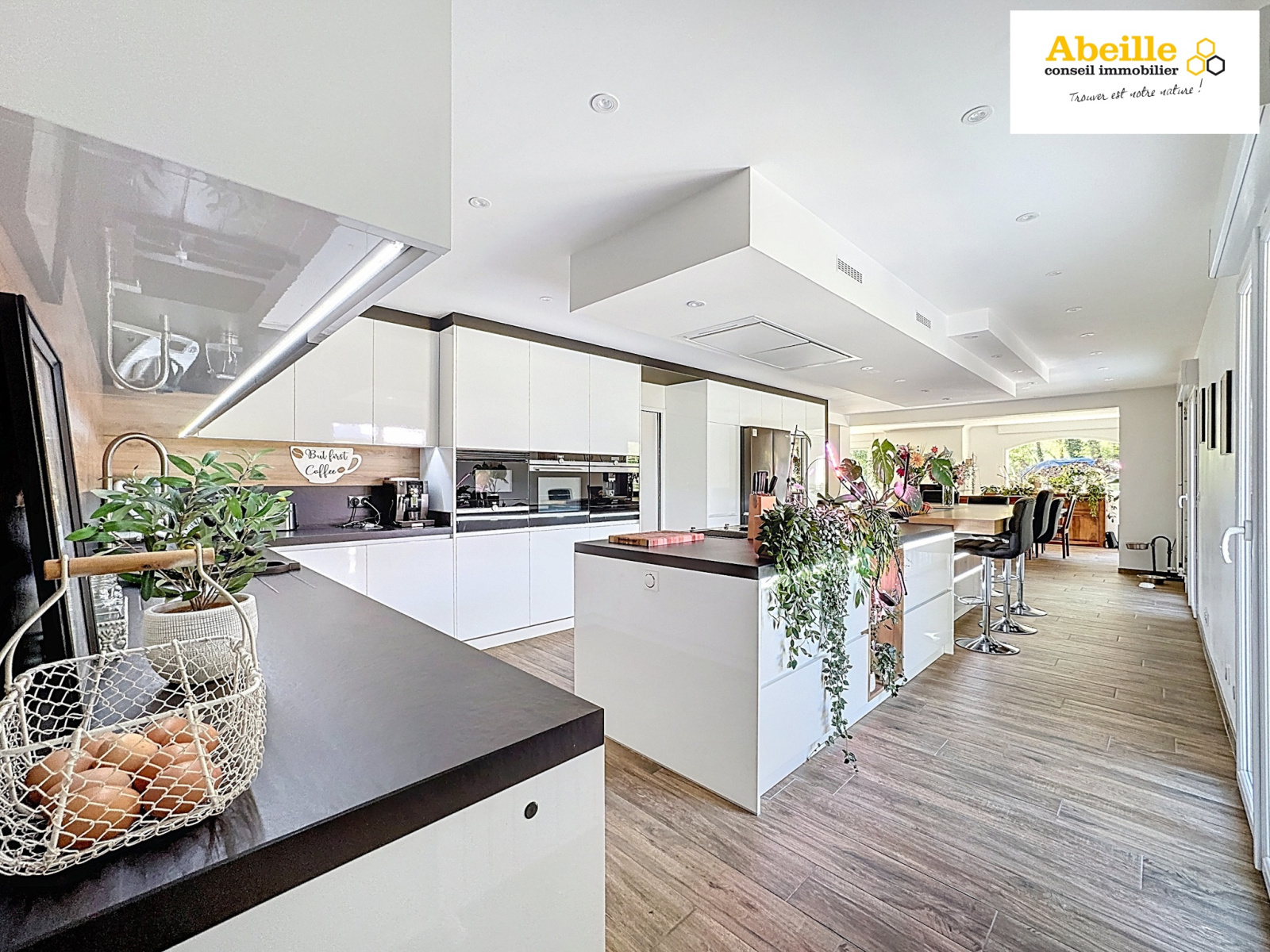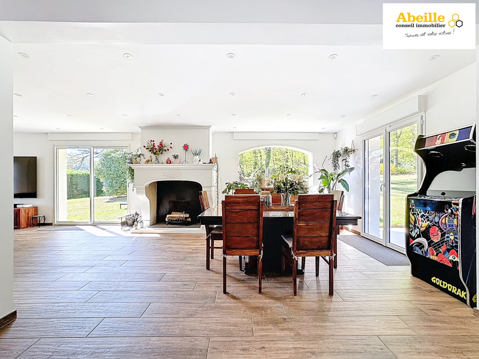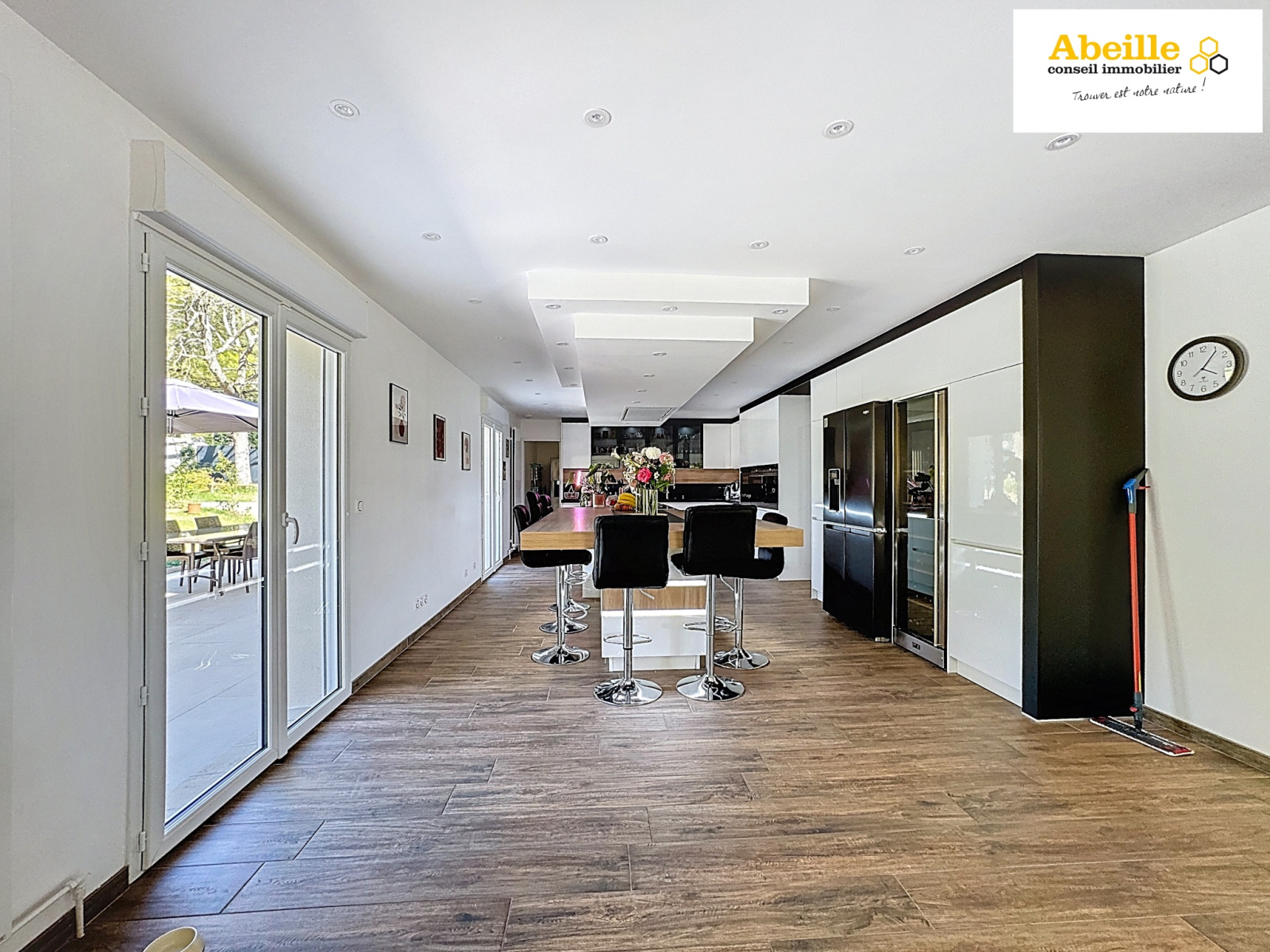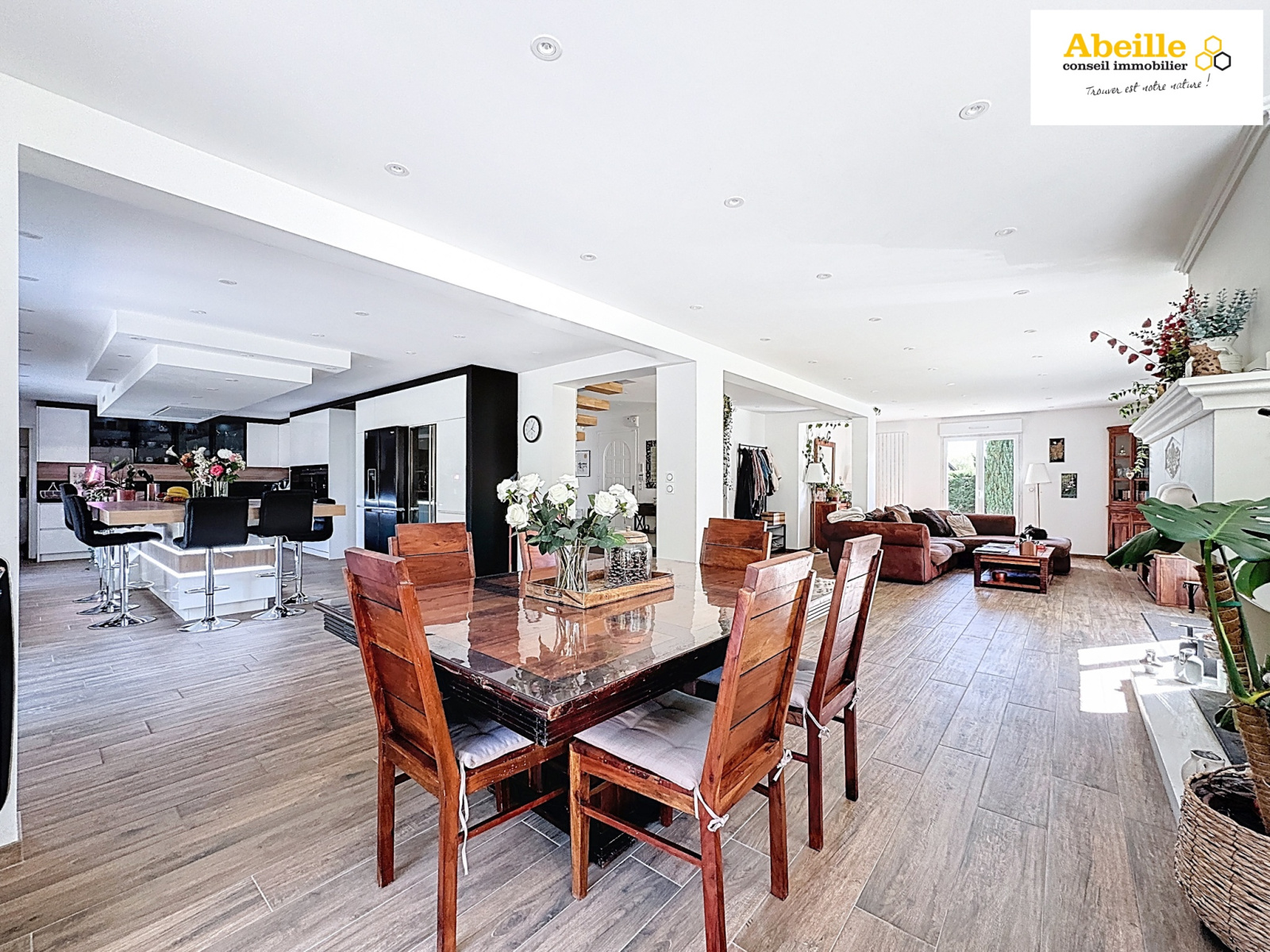 Offrant 240 m² habitables, cette maison allie confort, espace et prestations de qualité. Vous serez séduits dès l’entrée par un vaste hall qui s’ouvre sur une pièce de vie exceptionnelle de 100 m², lumineuse et chaleureuse, avec cheminée et cuisine dînatoire entièrement équipée. De larges ouvertures permettent un accès direct aux extérieurs et terrasses, parfaits pour profiter des beaux jours. Ce niveau comprend également une buanderie/lingerie, des WC indépendants, ainsi qu’une chambre avec salle de douches privative. À l’étage, une mezzanine pouvant faire office de bureau ou de chambre supplémentaire dessert trois belles chambres, dont une suite parentale avec salle de bains et dressing, une salle de douches et des WC séparés. Le sous-sol total propose un garage pouvant accueillir jusqu’à trois voitures, un espace pour motos et un local technique.