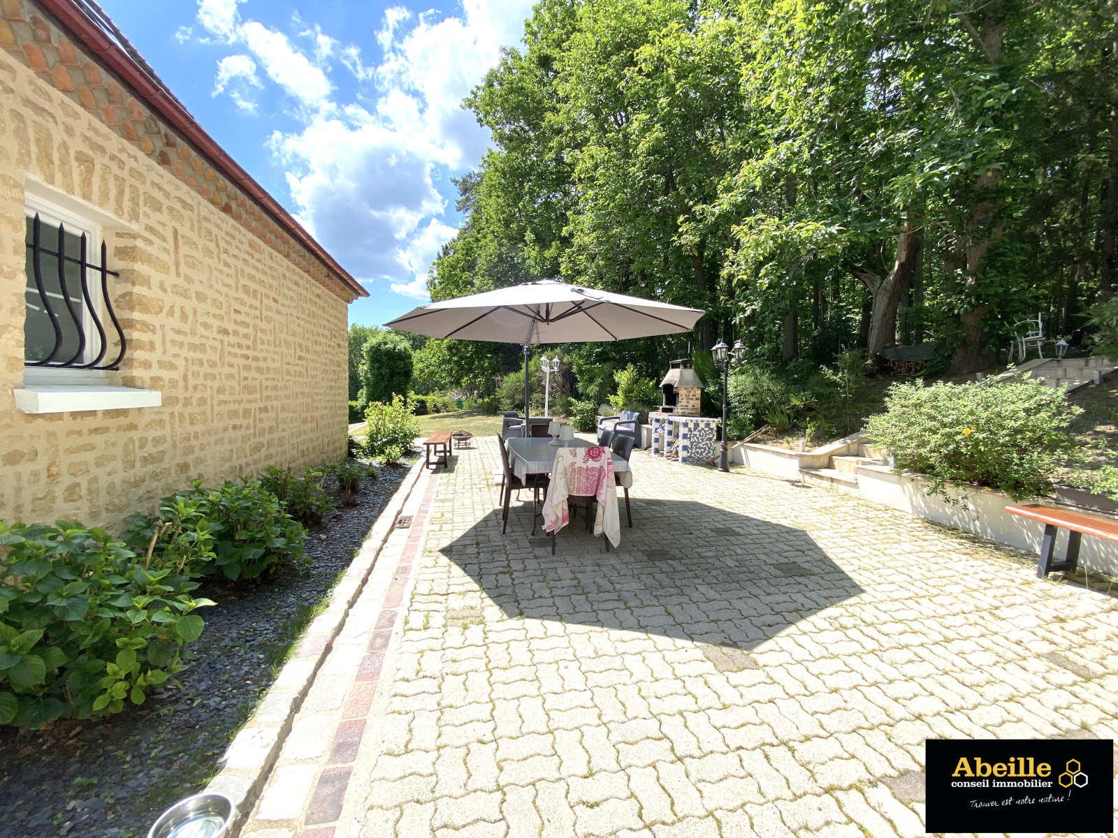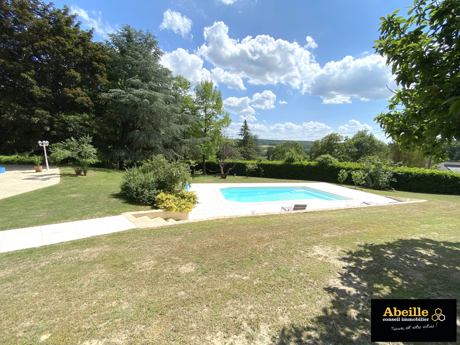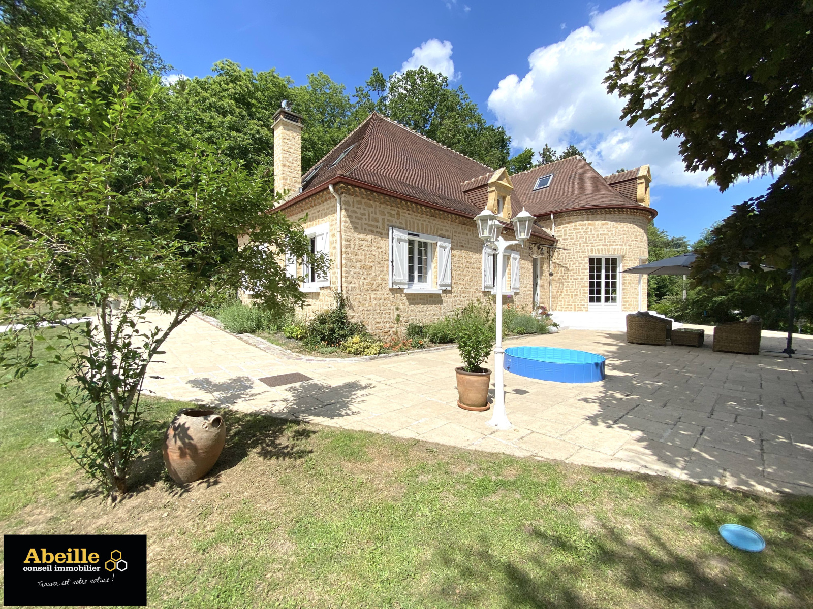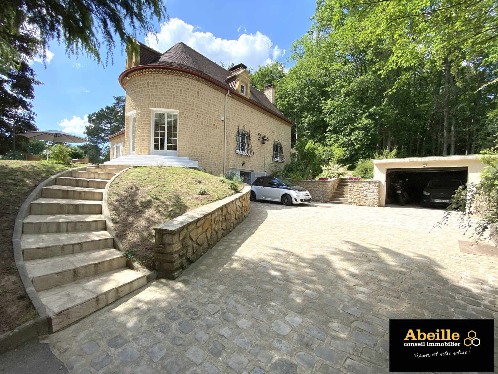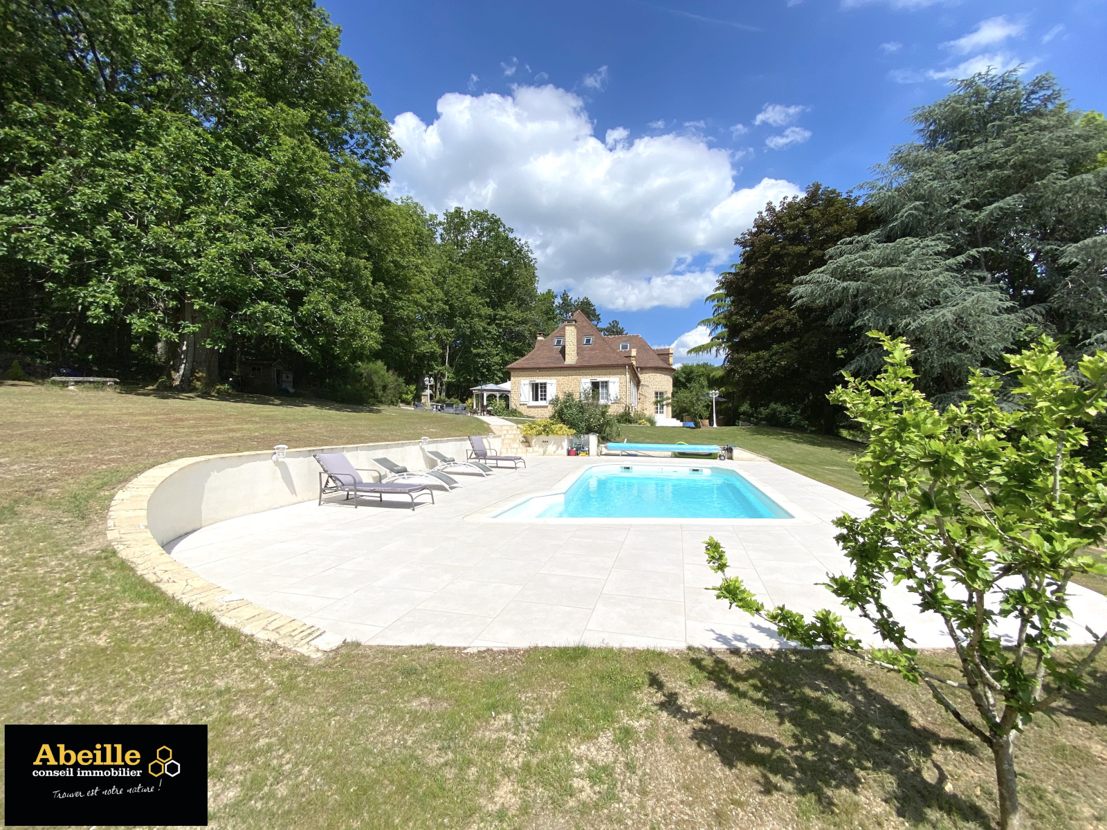 Edifiée en 1960, cette bâtisse en pierres de Sarlat offre : Hall, salon/séjour avec bow windows et cheminée, cuisine aménagée équipée, Salle à manger (véranda), 3 chambres, salle de douches, WC. A l'étage : dégagement/salle de jeux, dressing, 3 chambres dont une avec Mezzanine, salle de douches, WC. En sous sol : lingerie, chaufferie/buanderie, cave, local technique/cellier, garage. En dépendance : garage 3 voitures. DV PVC. C.c. gaz de ville. Vaste terrasse. Piscine chauffée. Nombreuses prestations à découvrir. Le tout sur un parc clos d'environ 7155 m2.