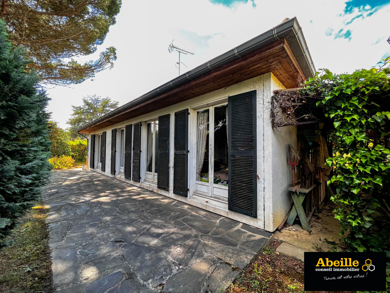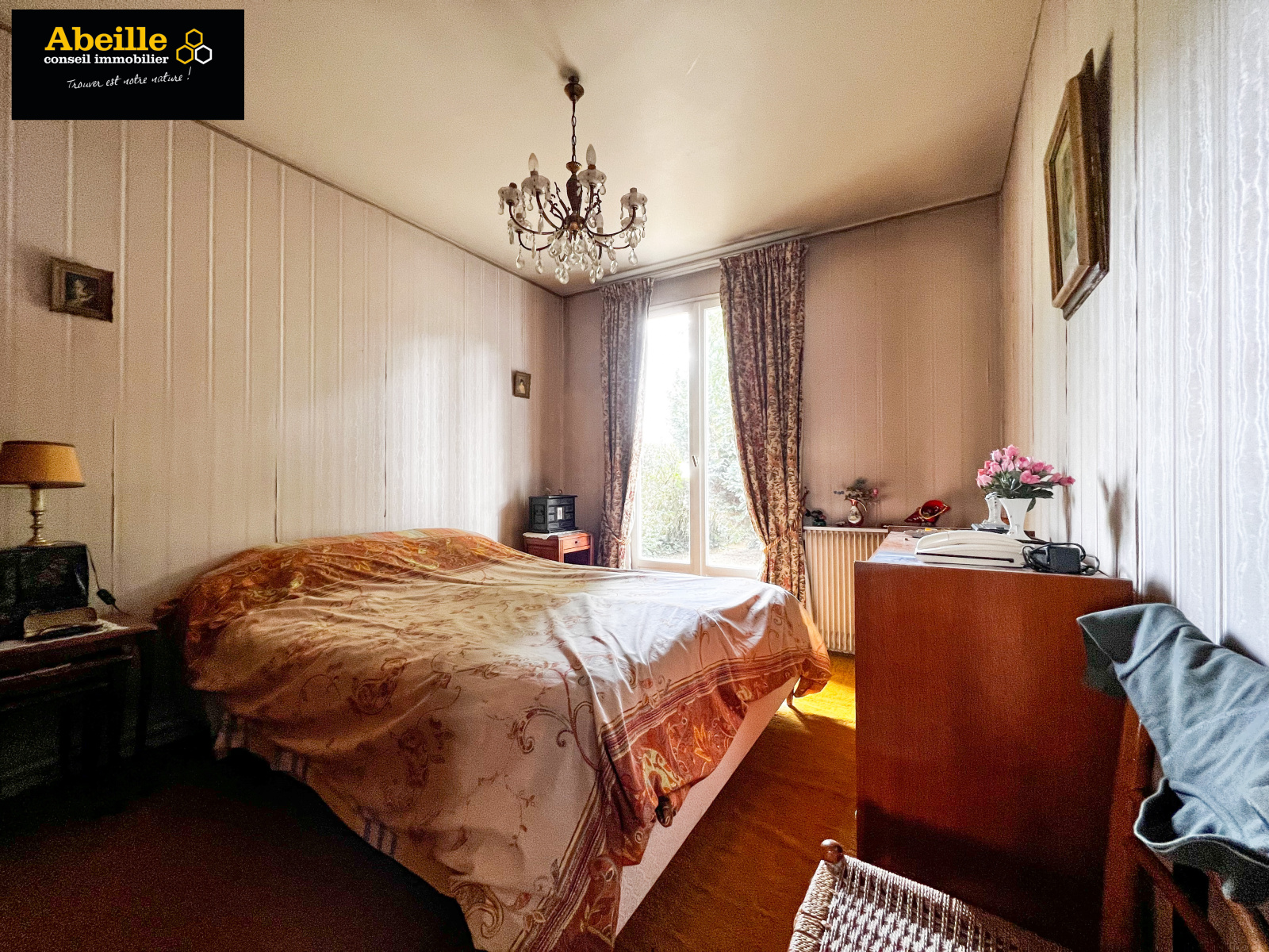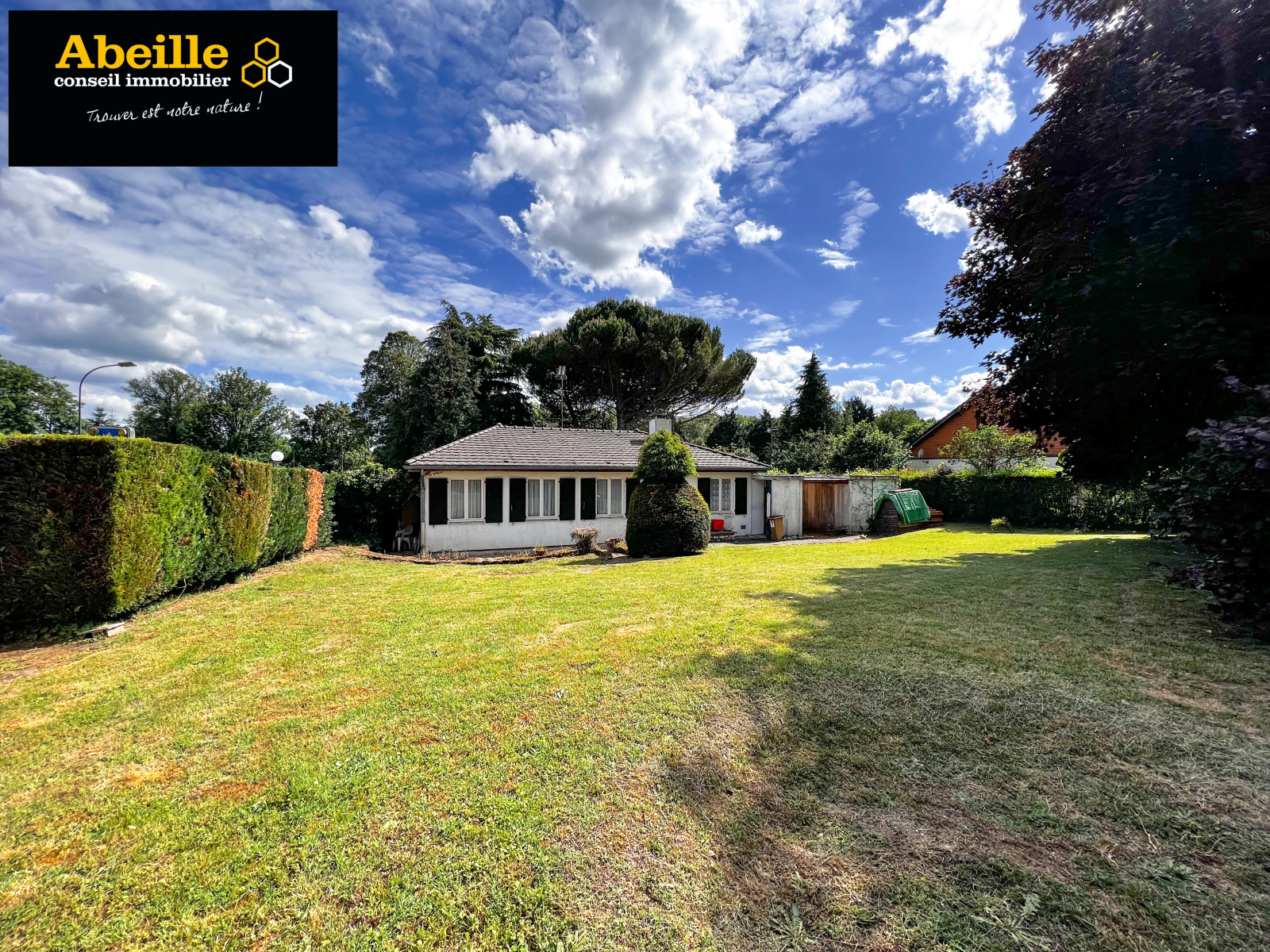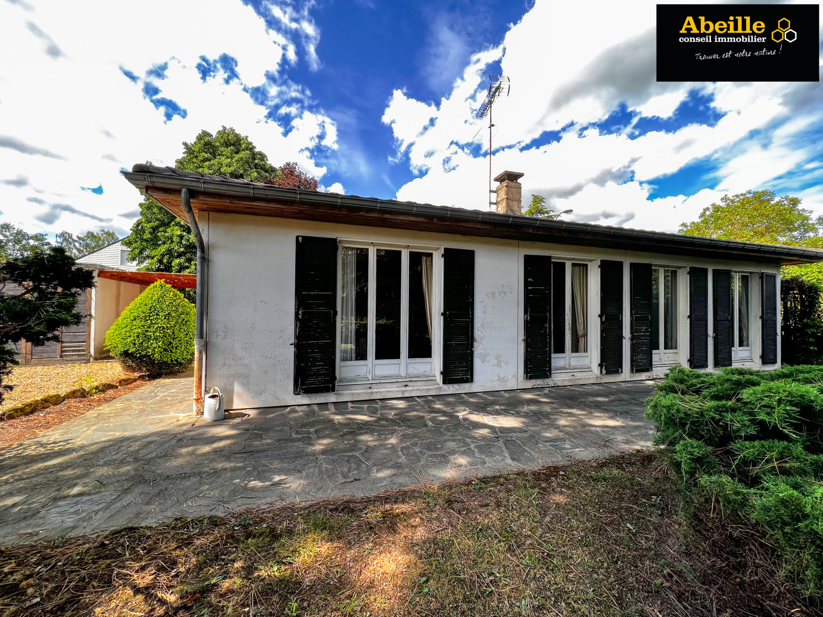 Edifiée en 1968, maison individuelle de plain-pied de 112 m2 hab. offrant : entrée avec placard, dégagement, cuisine aménagée équipée, cellier, salon/salle à manger avec cheminée, cinq chambres, salle de bains, wc, cabinet de toilette. Attenant : garage 1 voiture. C.c. gaz de ville. Expo sud. Le tout sur un terrain de 1202 m2. Travaux à prévoir. Le bien bénéficie de la jouissance d'un parc et de deux courts de tennis.