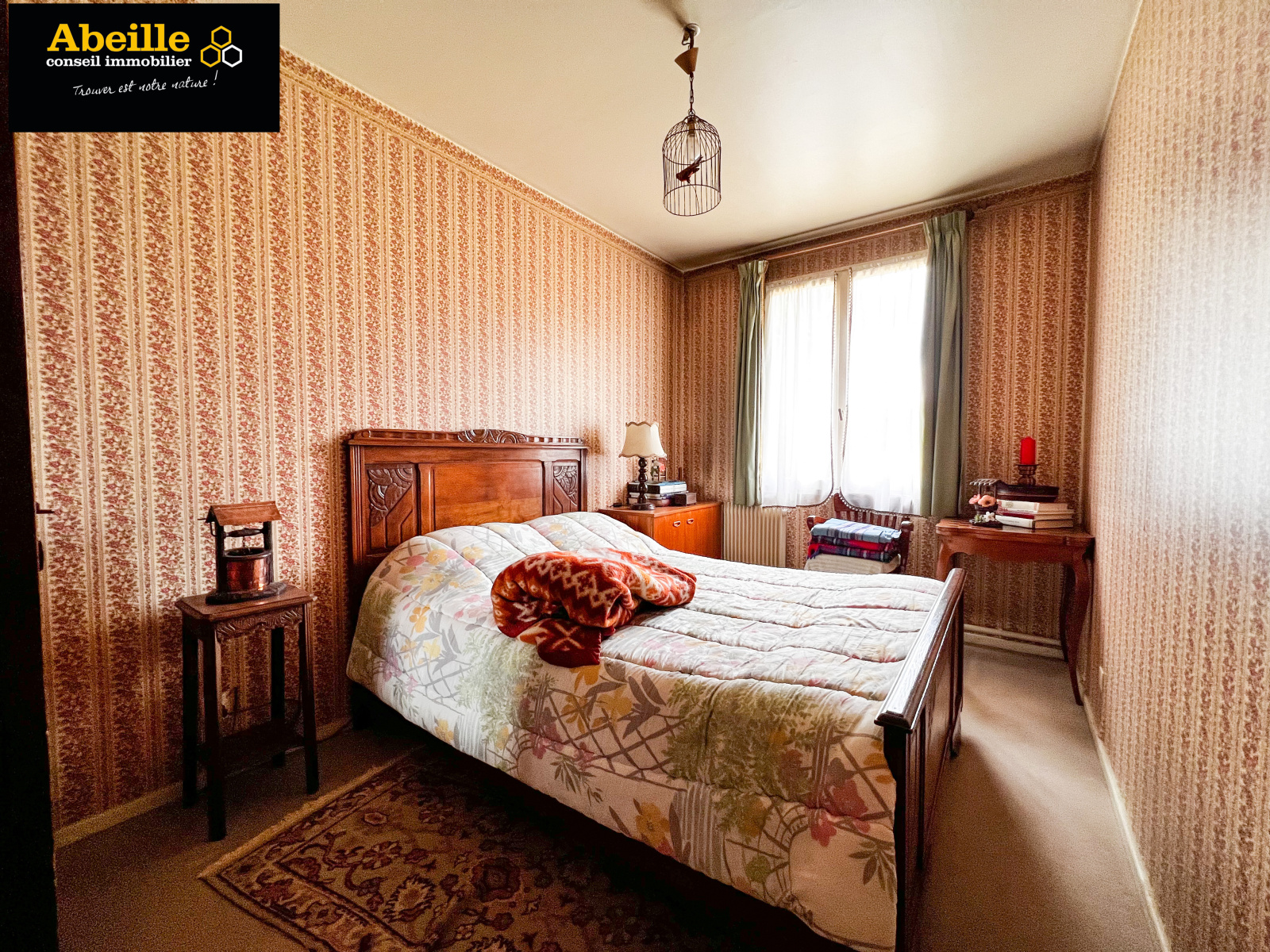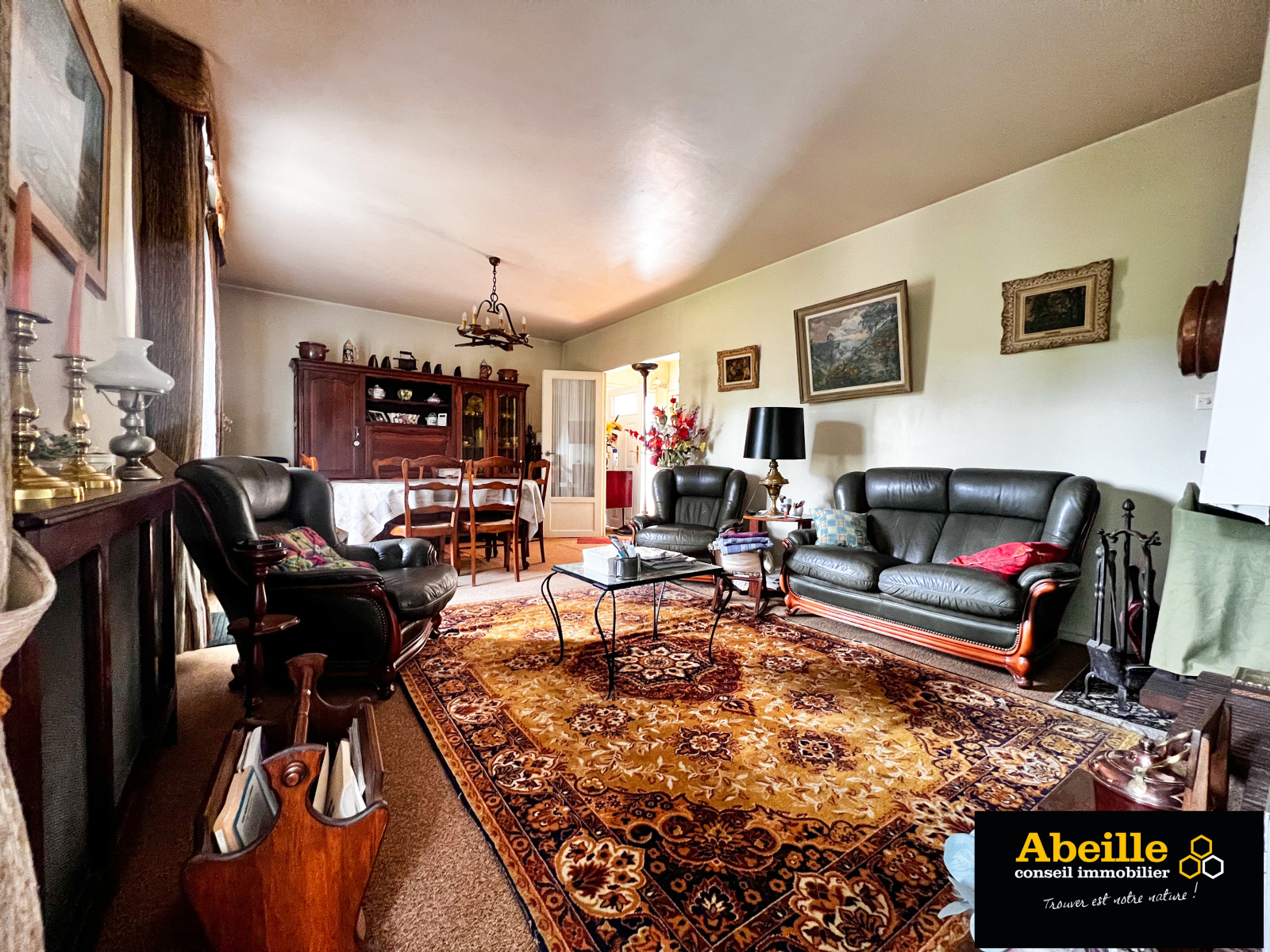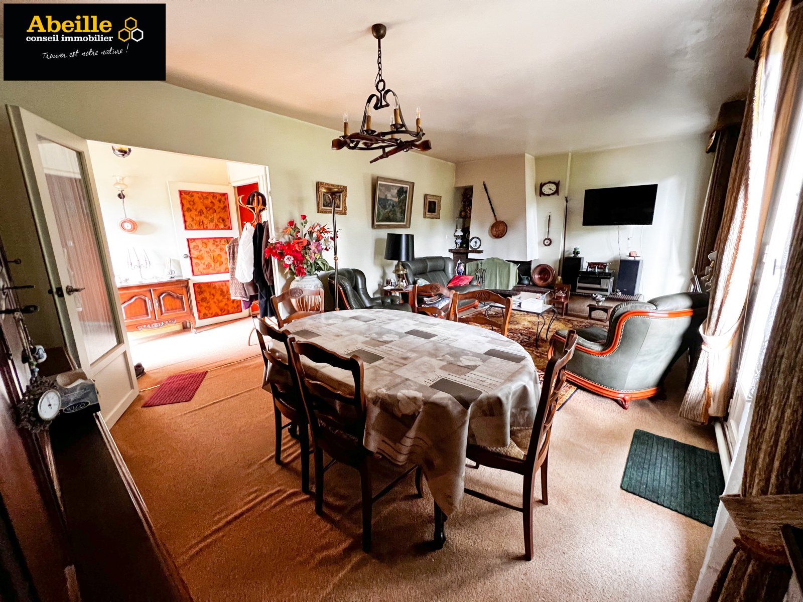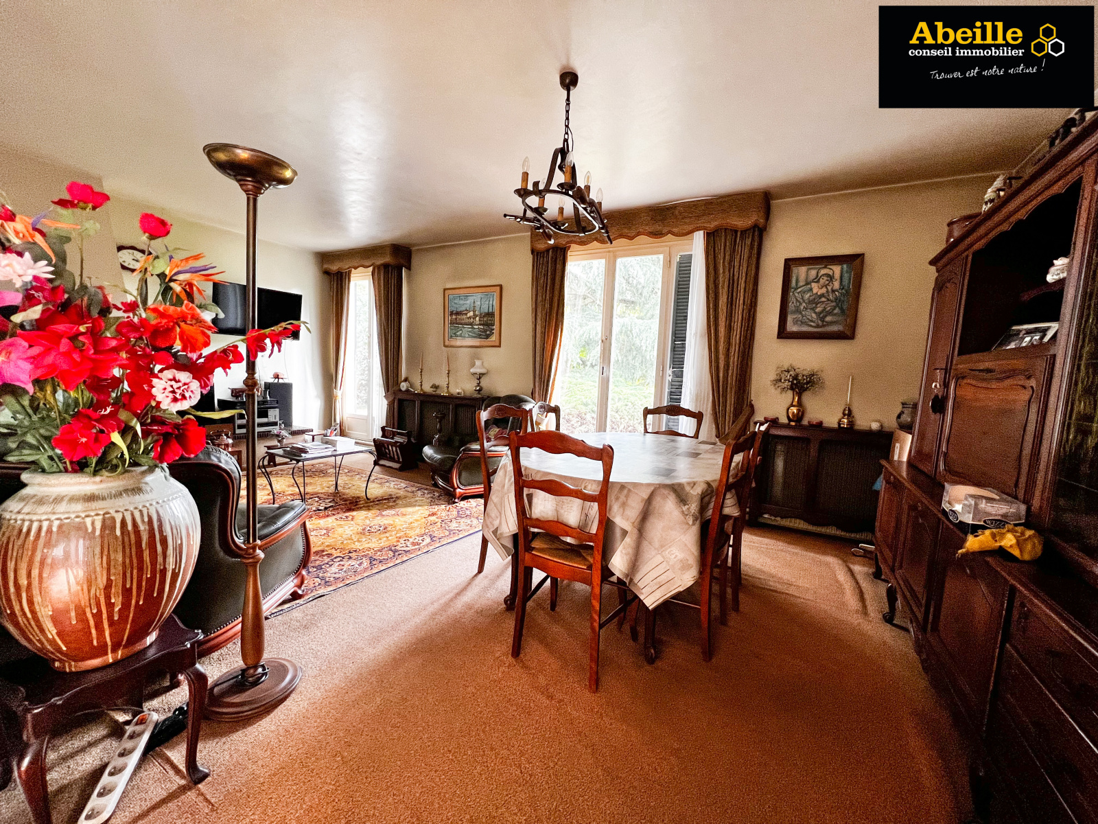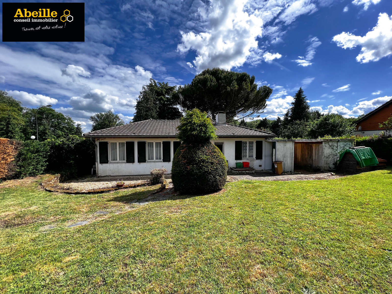 Edifiée en 1968, maison individuelle de plain-pied de 112 m2 hab. offrant : entrée avec placard, dégagement, cuisine aménagée équipée, cellier, salon/salle à manger avec cheminée, cinq chambres, salle de bains, wc, cabinet de toilette. Attenant : garage 1 voiture. C.c. gaz de ville. Expo sud. Le tout sur un terrain de 1202 m2. Travaux à prévoir. Le bien bénéficie de la jouissance d'un parc et de deux courts de tennis.
