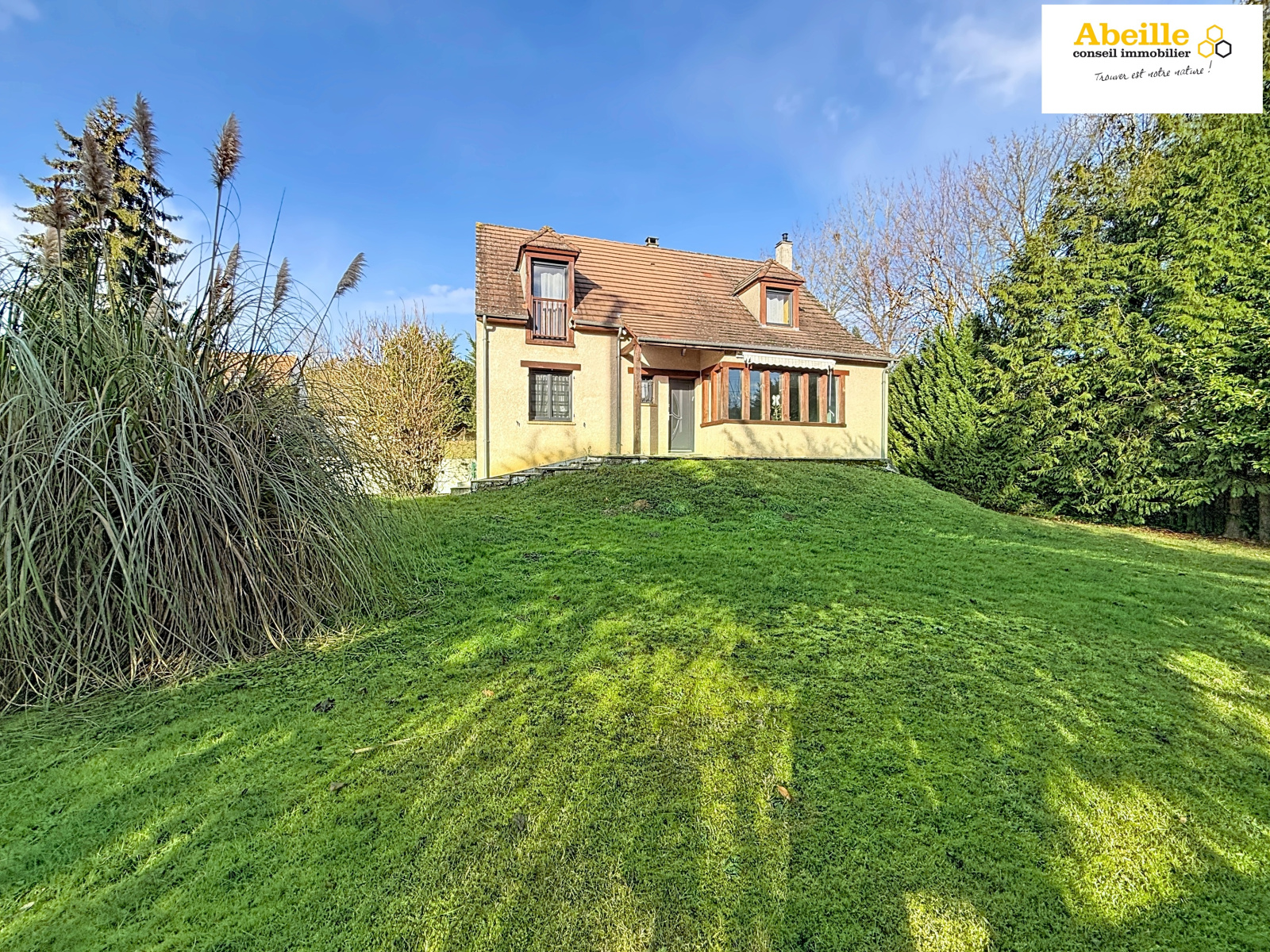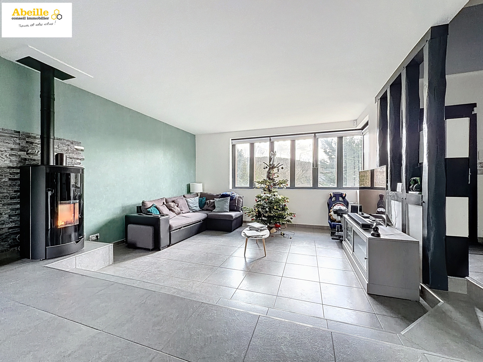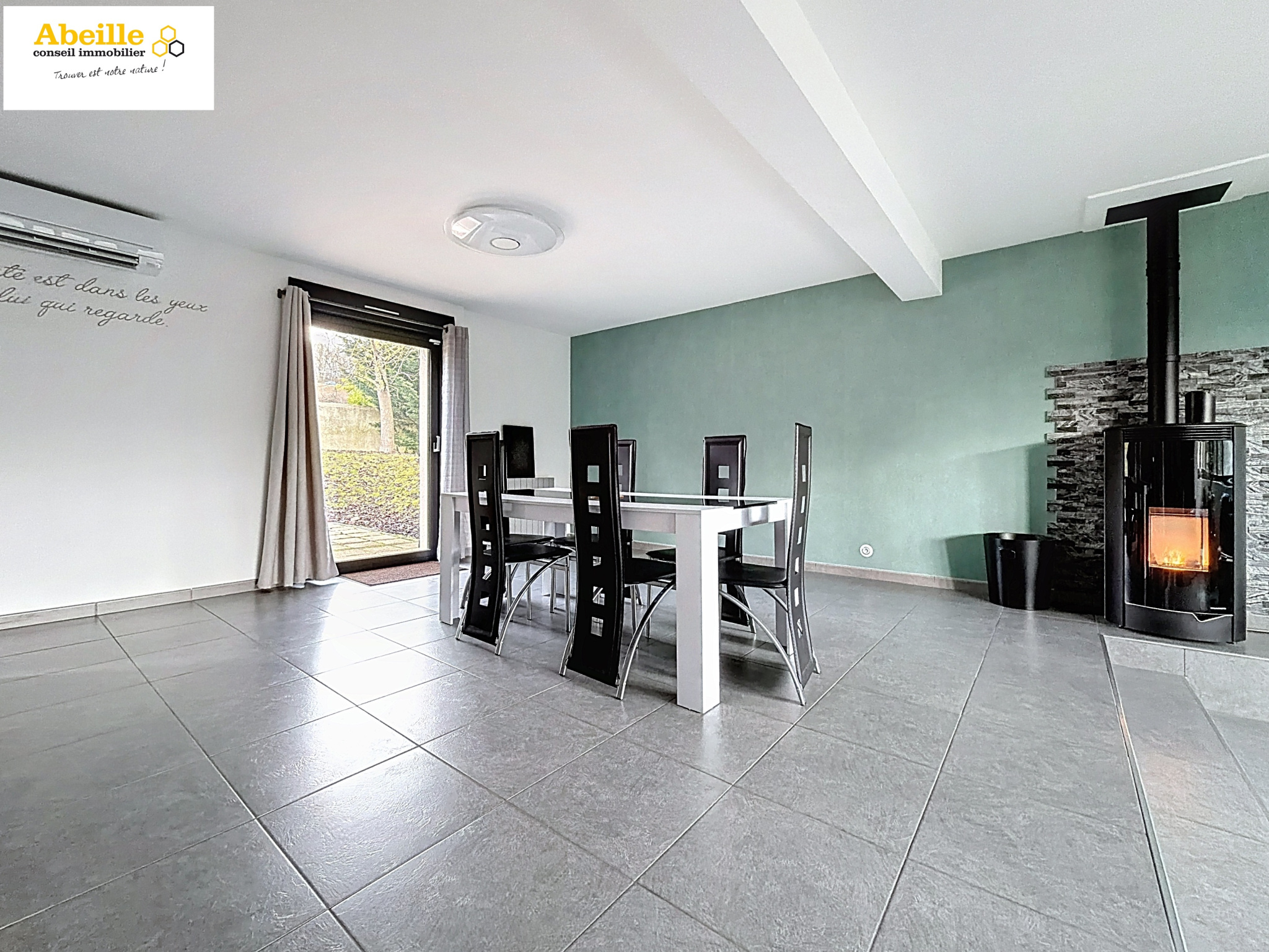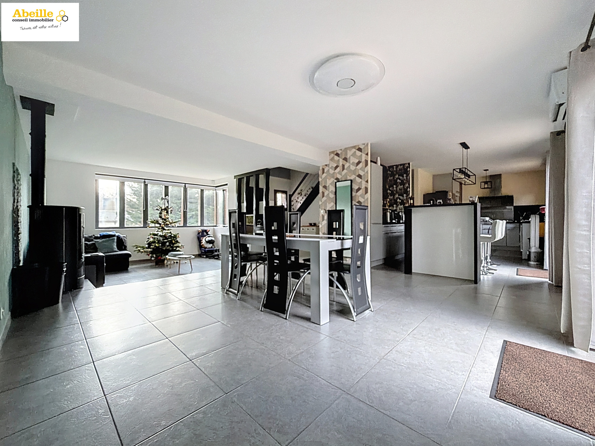 Maison année 1995 aux beaux volumes comprenant : entrée, salon/salle à manger avec poêle a granules, cuisine ouverte aménagée équipée. Chambre, salle d'eau et wc. A l'étage 3 chambres dont une suite parentale avec salle d'eau ainsi qu'une salle de bains avec douche, wc. Sous-sol total avec garage 3 voitures et buanderie. Double vitrage, climatisation réversible, belles prestations. Terrain clos de 984m2.