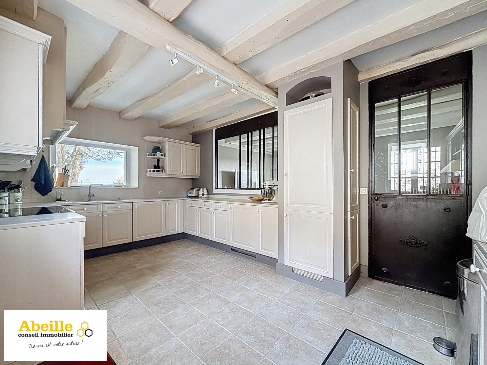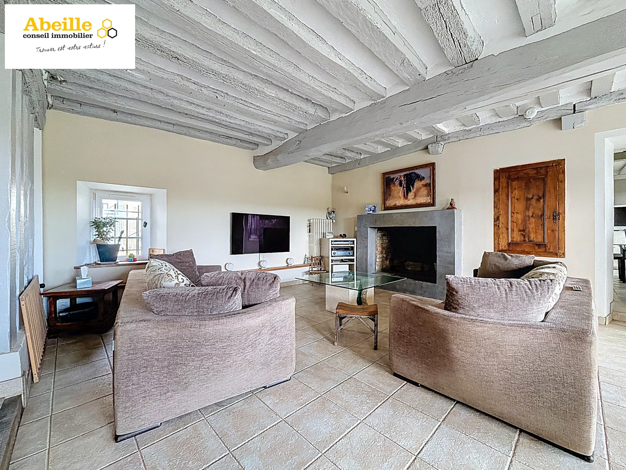 La maison principale, d’une surface habitable d’environ 249 m², propose une distribution fonctionnelle et de beaux espaces de vie. Au rez-de-chaussée, une entrée dessert un bureau, un salon/séjour avec cheminée à foyer ouvert, une salle à manger, une cuisine aménagée et équipée, un WC indépendant, ainsi qu’une chambre avec dressing et salle de bains comprenant baignoire et douche.